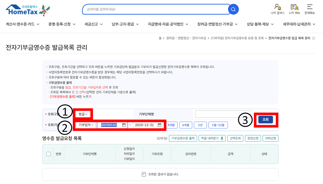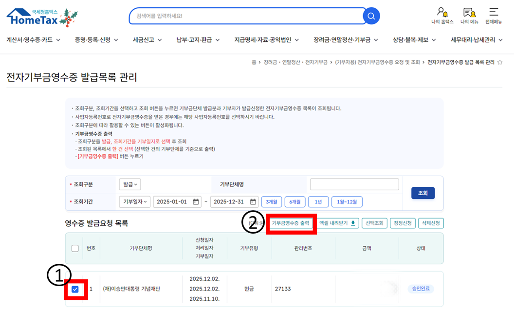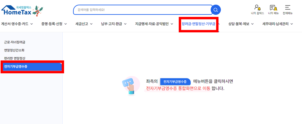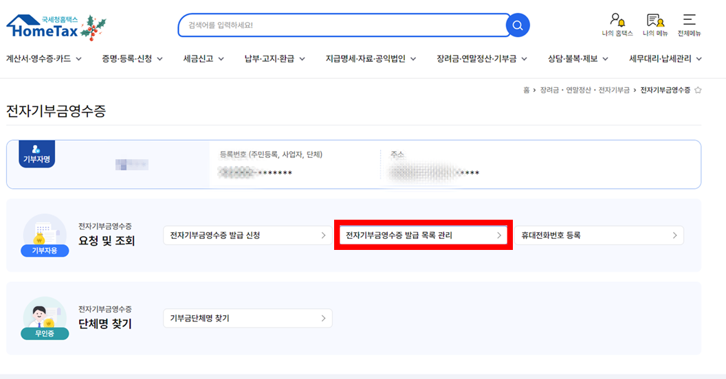 2. 기부금영수증 조회 및 출력 방법 * 국세청 홈택스 바로가기(클릭)