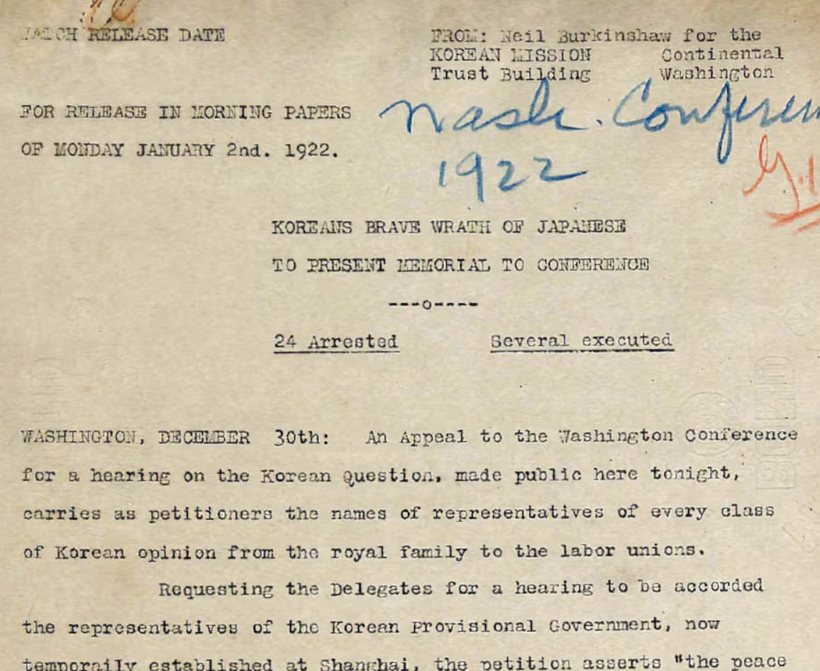 약소 민족의 독립 청원서, 어떻게 美 언론 30곳에 기사화됐을까 “한국인들, 일본의 분노를 무릅쓰고 워싱턴 회의에 탄원서를 제출하다(KOREANS BRAVE WRATH OF JAPANESE TO PRESENT MEMORIAL TO CONFERENCE).” 종이에 타자기로 타이핑돼 있고, 왼쪽 상단에 ‘배포 일시: 1922년 1월 2일 월요일 조간신문’이라 적힌 이 영문 문서의 정체는 무엇인가? 바로 ‘보도자료’다. 기사가 언론에 보도되기를 원하는 기관이 정보를 담아 언론사에 배포하는 자료다. 연세대 이승만연구원의 자료 더미 속에서 최근 한국학중앙연구원의 ‘미공개 이승만 문서 정리·분류 및 DB화 사업’으로 처음 발굴된 이 자료는 1921년 11월부터 1922년 2월까지 열린 ‘워싱턴 회의’ 당시 이승만이 외교 독립 운동을 어떻게 펼쳤는지 보여 준다. 자료는 “24명 체포되다” “여러 명이 처형 당하다”란 문구 아래 다음과 같은 내용을 썼다. “워싱턴, 12월 30일: 한국 문제 청원을 위해 워싱턴 회의에 드리는 호소문은 오늘 밤 이곳에서 발표됐다. 이 호소문에는 왕실부터 노동조합에 이르기까지 모든 계층을 대표하는 한국인들의 이름이 청원자로 서명돼 있다.”