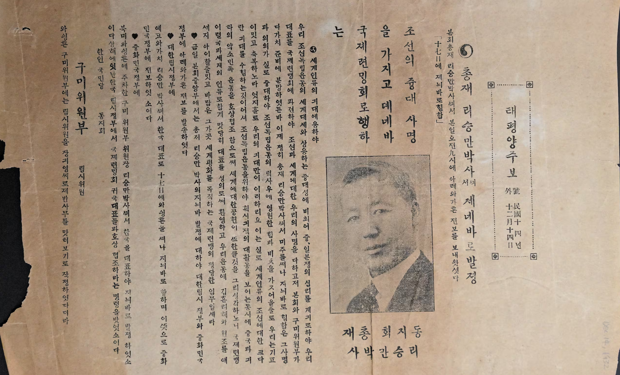 찢겨 나온 듯한 낡은 종이 한 장이 있다. 그 위에 한글로 세로쓰기를 한 문장이 쓰여 있다. “조선의 중대 사명을 가지고 제네바 국제연맹회로 향하는 동지회 총재 이승만 박사”. 동지회(대한인동지회)는 1921년 미국 하와이에서 조직된 독립운동 단체다. 이 문건은 1932년 12월 14일 발행된 동지회 기관지 ‘태평양주보’의 호외다. 이승만대통령기념재단의 김정민 책임연구원은 지난 7일 미국 UCLA 찰스 영 도서관에서 이 자료를 처음 찾아내 본지에 공개했다. 이것은 이승만이 1933년 스위스 제네바에서 외교 독립운동을 펼치기 위해 미국을 떠난다는 내용이다. 당시 대서양 항해 도중 배 위에 선 이승만 사진도 처음 원본이 확인됐다. ‘태평양주보’는 독립운동사의 귀중한 1차 사료지만 발견되지 않은 호수가 많아 연구에 제한이 있었다. 이승만의 제네바행(行) 관련 호외를 발행했다는 것은 이번에 처음 밝혀졌는데, 이봉창·윤봉길 의거 정도가 호외 발행 대상이었다. 그만큼 한인 사회에서 이승만의 외교 독립운동이 중대한 사건으로 인식됐다는 것을 알 수 있다.